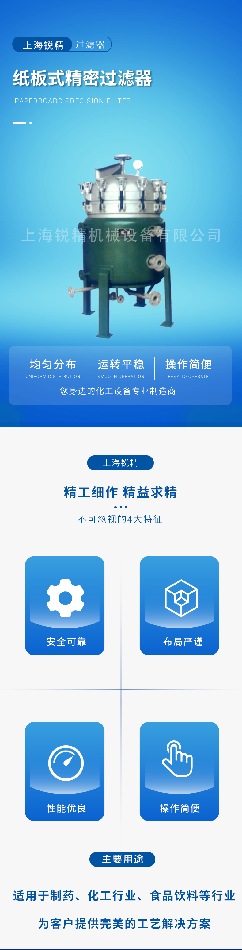 - 簡要描述:?紙板式精密過濾器?是一種在密閉筒體內,由若干片水平放置的濾板中間裝夾濾紙組成的過濾設備。依靠濾紙作為過濾介質,在密閉容器內進行加壓過濾。