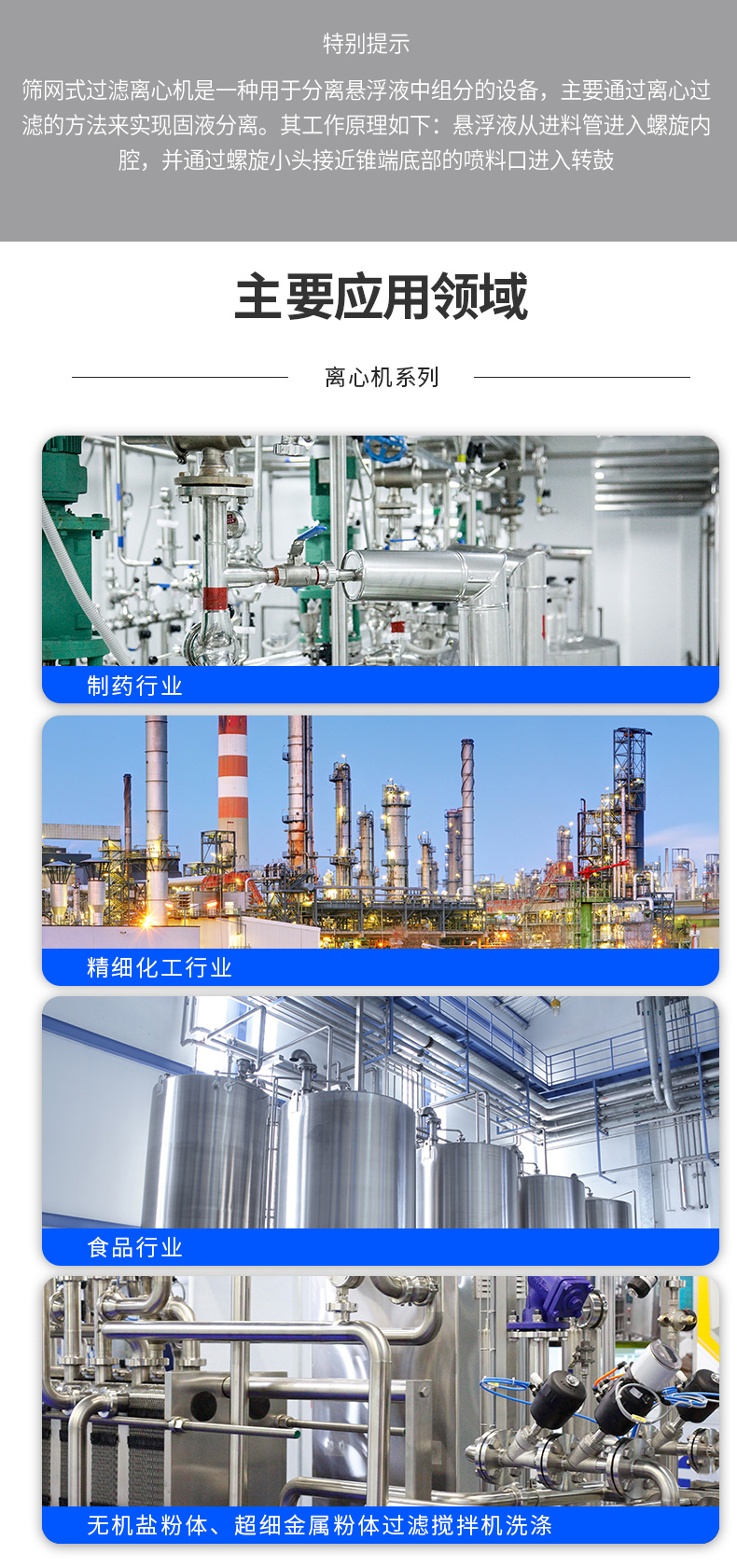 - 簡要描述:篩網式過濾離心機?是一種用于分離懸浮液中組分的設備,主要通過離心過濾的方法來實現固液分離。