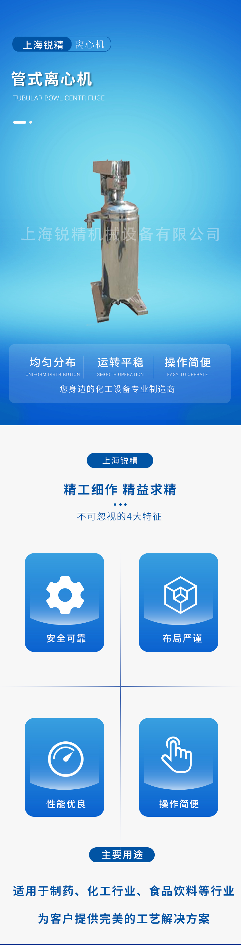 - 簡要描述:管式離心機?是一種利用離心力進行液體與固體顆粒、液體與液體混合物中各組分分離的設備。它主要由轉鼓、傳動裝置、機身和收集板等組成,